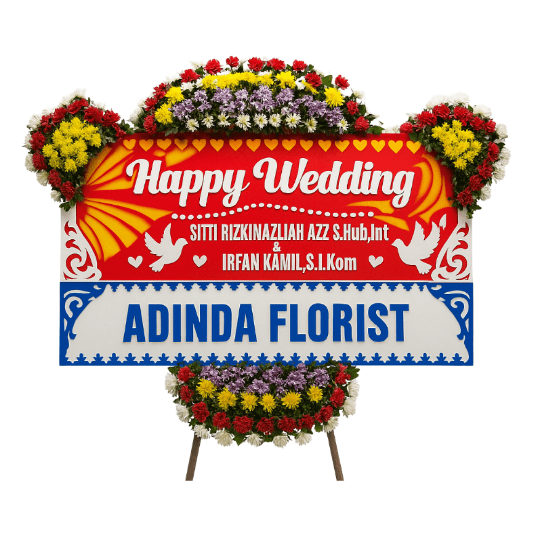 Karangan Bunga Papan Bugatti disempurnakan dengan rangkaian bunga hias yang melimpah, tidak hanya di bagian tengah atas dan bawah, tetapi juga di kedua sudut atas papan. Rangkaian bunga ini tersusun padat, menggunakan kombinasi warna-warna cerah seperti merah, kuning, ungu/merah muda, dan putih. Bunga-bunga ini menciptakan mahkota yang mewah di bagian atas dan rangkaian yang padat di bagian bawah, memberikan keseimbangan visual yang anggun dan meriah. Papan ini ditopang oleh penyangga yang kokoh, menjadikannya persembahan ucapan selamat pernikahan yang sangat berkelas, romantis, dan penuh harapan.