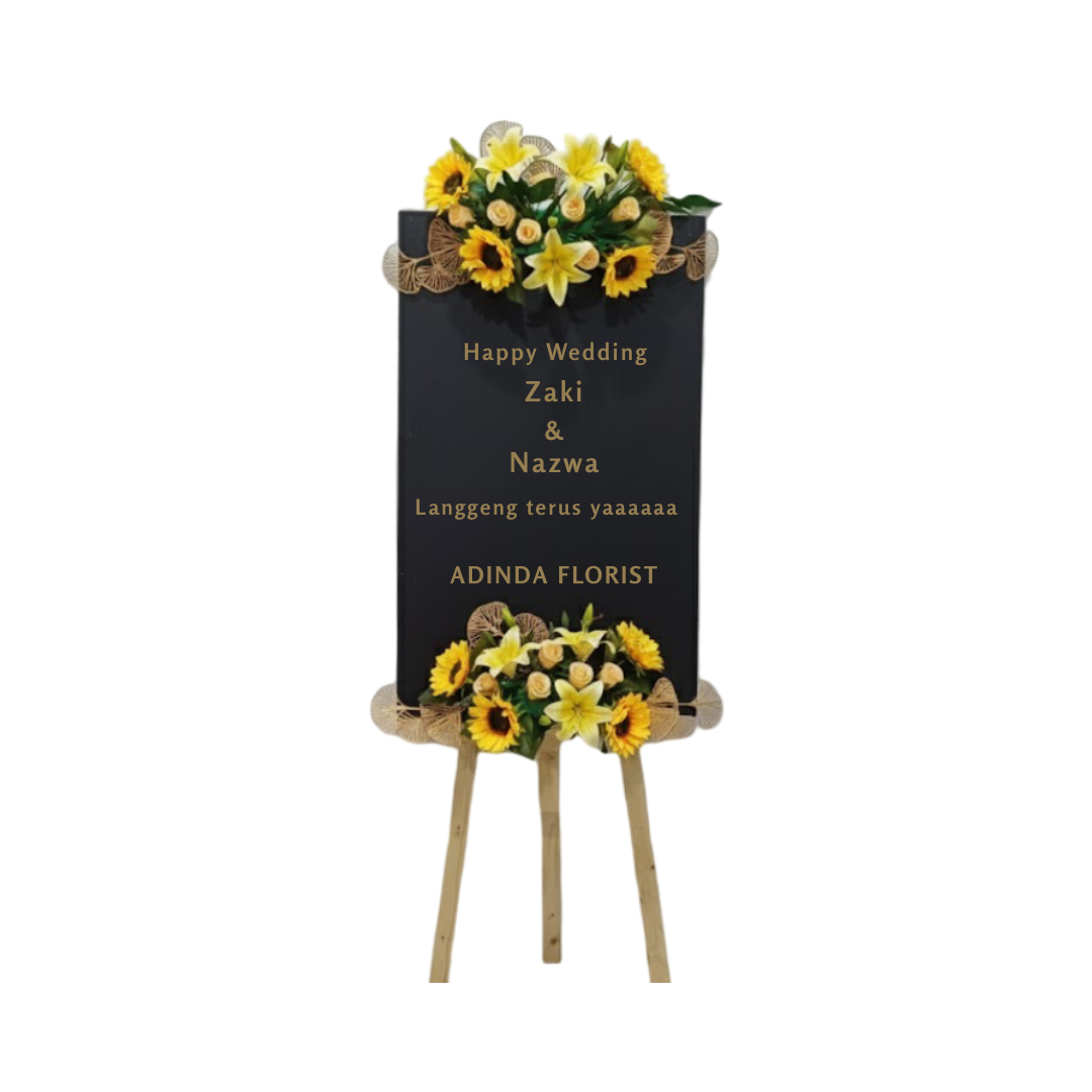 Kemewahan papan ini ditingkatkan melalui rangkaian bunga hias yang ditempatkan secara strategis, bukan mengisi seluruh tepi seperti desain tradisional. Bunga ditempatkan dalam dua rangkaian bundar yang padat dan simetris, yaitu di bagian atas papan dan di bagian dasar (dekat kaki penyangga). Rangkaian bunga ini didominasi oleh perpaduan bunga matahari (sunflower) berwarna kuning cerah dan bunga lili atau sejenisnya berwarna kuning muda atau putih. Kombinasi kuning cerah ini memancarkan kegembiraan, optimisme, dan kehangatan.
