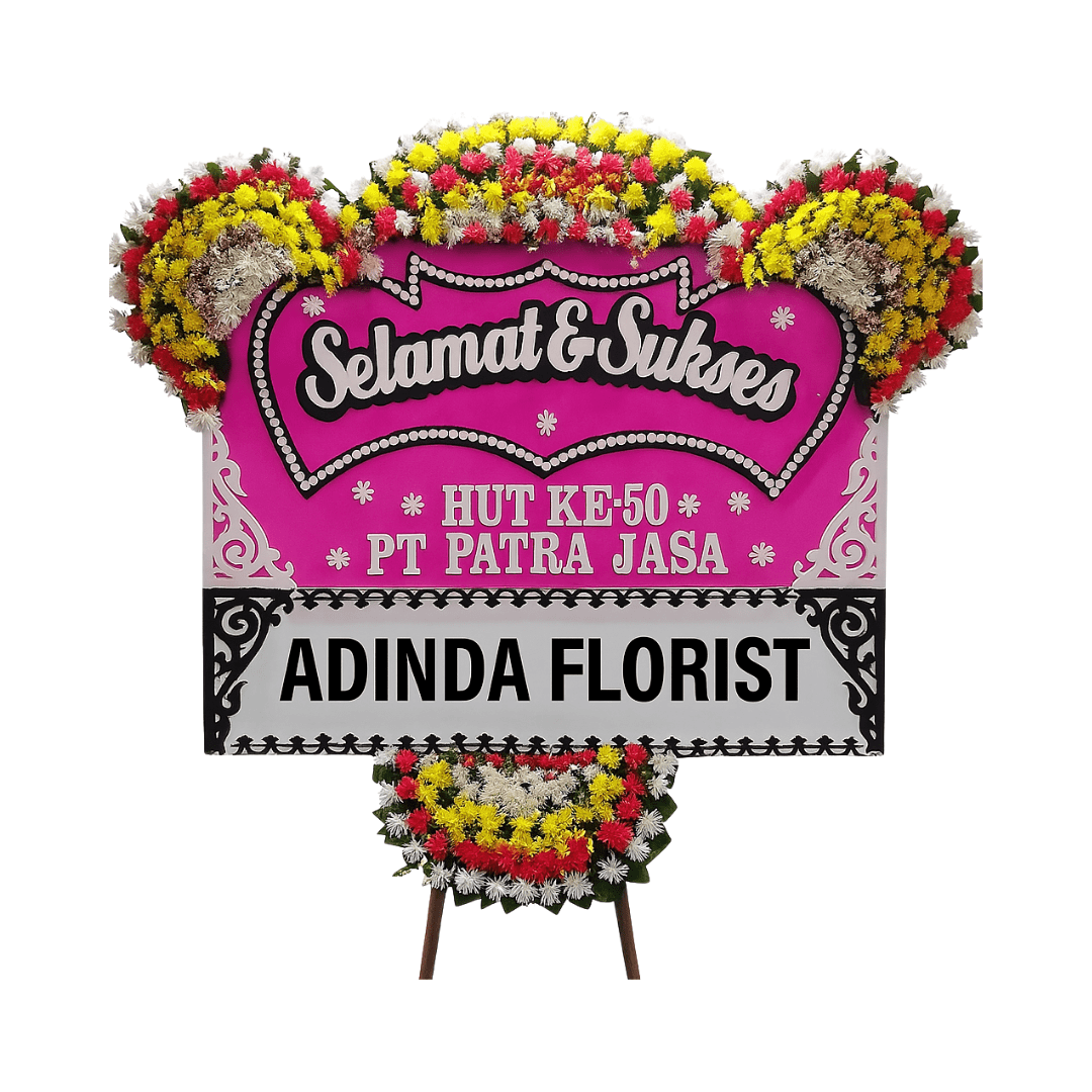 Karangan Bunga Papan Devel adalah persembahan ucapan selamat dan sukses yang sangat meriah, vibrant, dan dirancang dengan nuansa modern yang elegan, menjadikannya statement publik yang memancarkan kegembiraan, kesuksesan, dan apresiasi melalui penggunaan warna pink cerah dan hitam yang kontras. Desain ini sangat cocok untuk menandai momen penting perusahaan seperti ulang tahun (HUT) atau perayaan pencapaian.
