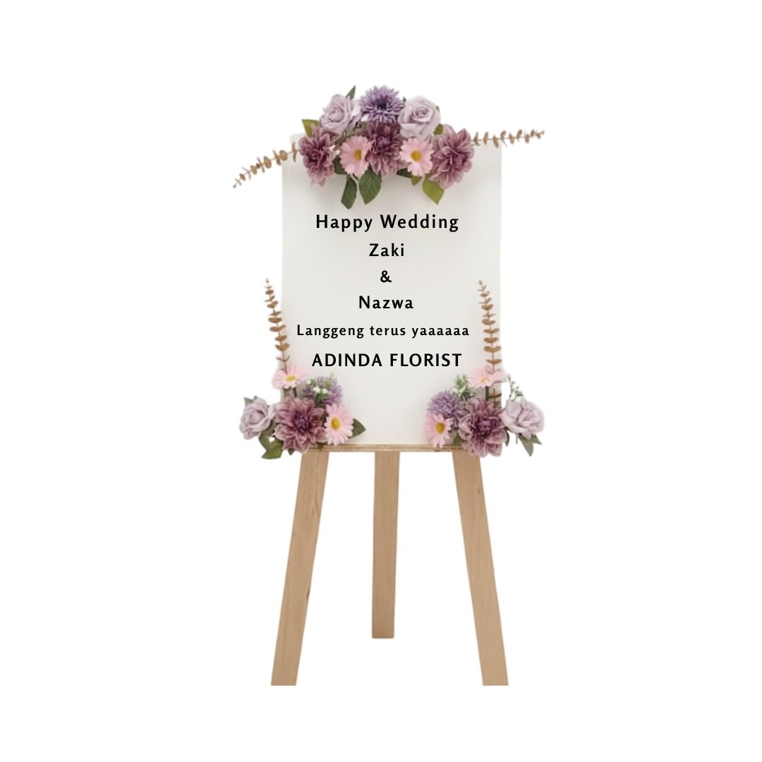 Kemewahan papan ini ditingkatkan melalui rangkaian bunga hias yang ditempatkan secara terfokus dan artistik, menonjolkan warna dusty purple sebagai tema utama. Bunga ditempatkan dalam tiga rangkaian utama: satu di bagian puncak atas papan dan dua rangkaian simetris yang membingkai bagian bawah area teks. Rangkaian bunga ini didominasi oleh palet warna ungu mauve, dusty purple, dan blush pink yang lembut. Bunga utama yang digunakan meliputi mawar berukuran sedang, gerbera daisies, dan bunga kecil pendamping, semuanya dalam gradasi ungu dan pink yang lembut.