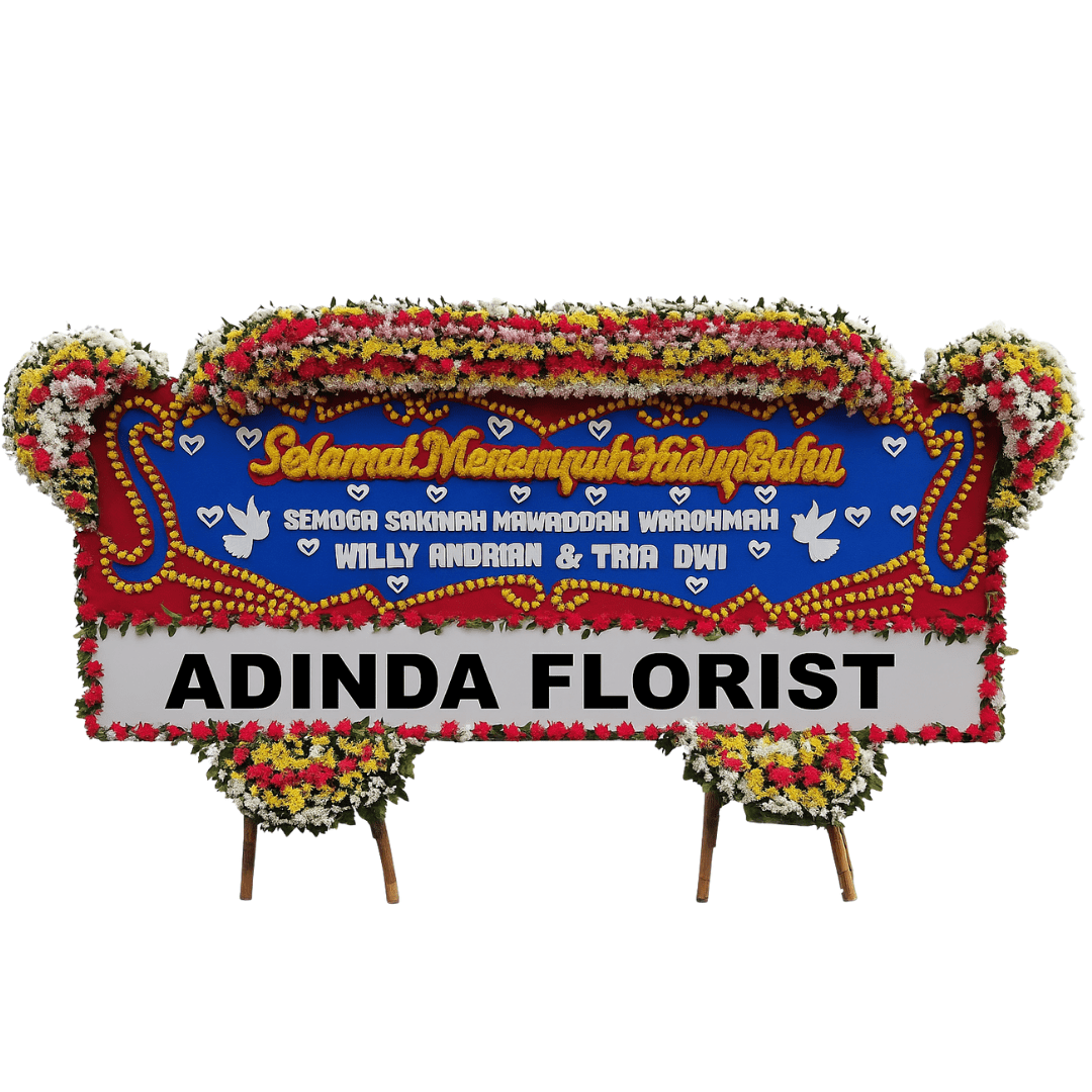 Karangan Bunga Papan Gogde adalah persembahan ucapan selamat pernikahan yang sangat meriah, romantis, dan dirancang dengan nuansa klasik yang kental, menjadikannya statement publik yang memancarkan kegembiraan, cinta, dan harapan yang mendalam bagi pasangan pengantin baru. Papan bunga ini menonjolkan kombinasi warna biru tua, merah, dan putih yang sangat kontras, melambangkan ketenangan, gairah, dan kesucian.