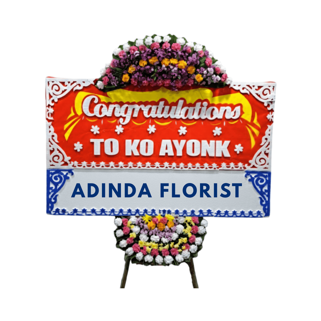 Karangan Bunga Papan Rosy disempurnakan dengan rangkaian bunga hias yang melimpah di bagian atas dan bawah papan. Rangkaian bunga ini tersusun padat, menggunakan kombinasi warna-warna cerah seperti merah, kuning, ungu/merah muda, dan putih. Bunga-bunga ini menciptakan mahkota setengah lingkaran yang mewah di bagian atas dan rangkaian yang padat di bagian bawah, memberikan keseimbangan visual yang anggun dan meriah. Papan ini ditopang oleh penyangga yang kokoh, menjadikannya persembahan ucapan selamat yang sangat berkelas, festive, dan penuh semangat.